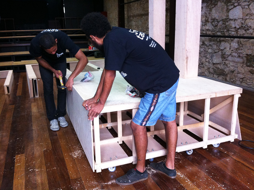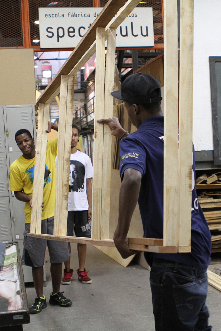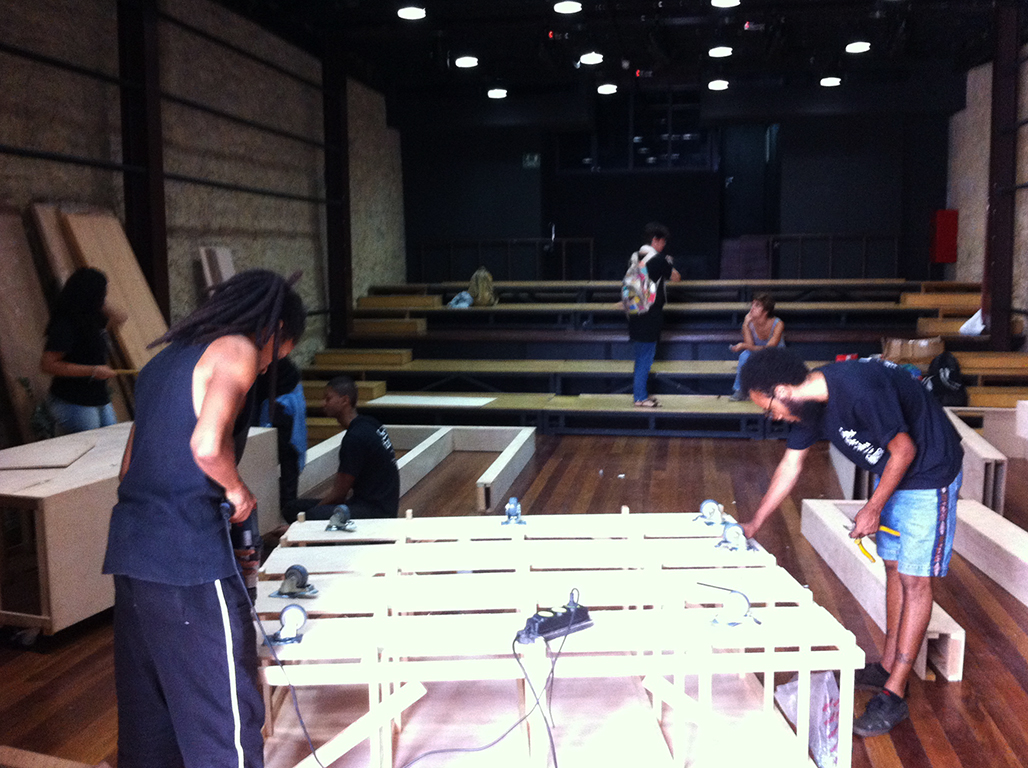 8 alunos de Montagem de Cenários viveram na prática todo o processo de construção dos cenários assinados pela cenógrafa Bia Kaysel para “Noises Off – Uma Peça pelo Avesso”, comédia que trata dos bastidores de uma peça na qual tudo dá errado. Sob a coordenação do instrutor Alex Augusto, os futuros cenotécnicos acompanharam do desenvolvimento do projeto na plataforma Sketchup à finalização, passando pela realização periódica de visitas técnicas. “Achamos que esta seria uma ótima oportunidade pedagógica para a prática da turma de Montagem de Cenários, uma vez que a demanda apresentada batia com o conteúdo que estava sendo aplicado no módulo do curso naquele momento”, explica Carla Vilardo, coordenadora do Núcleo de Trabalho da Spectaculu.