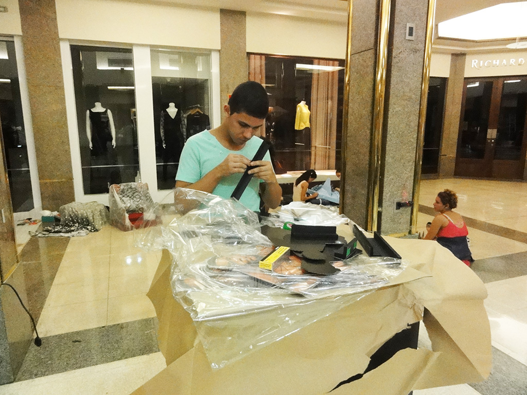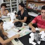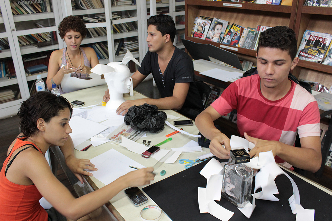 Logo na chegada, jovens trabalham na montagem da exposição