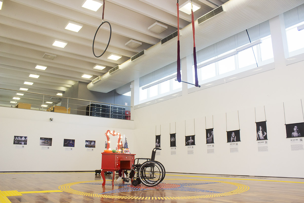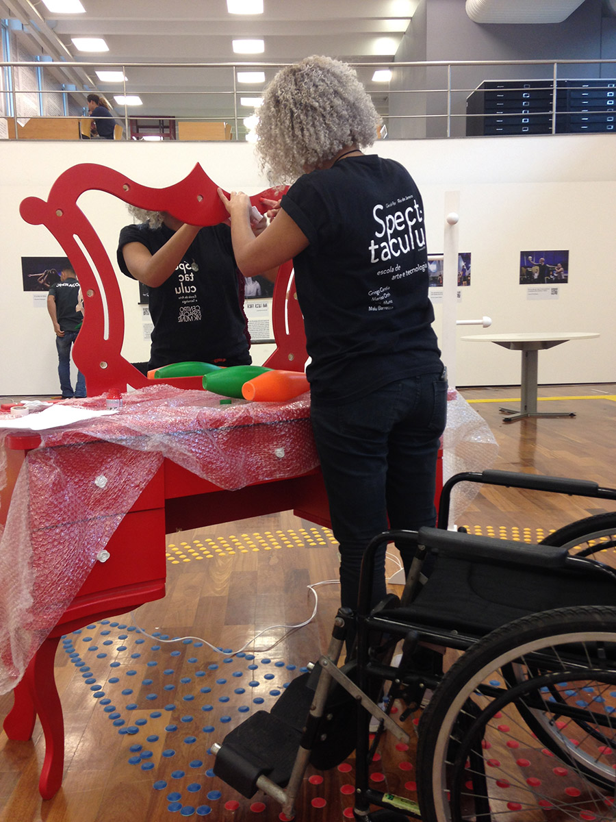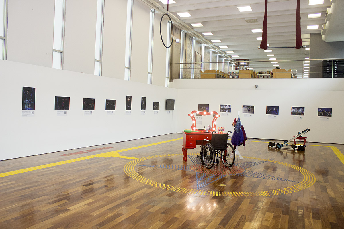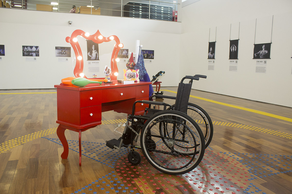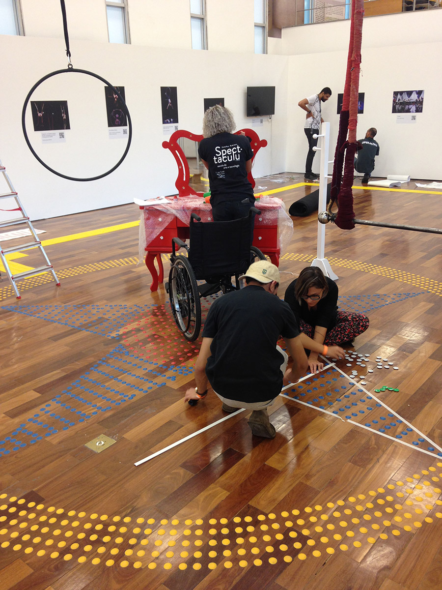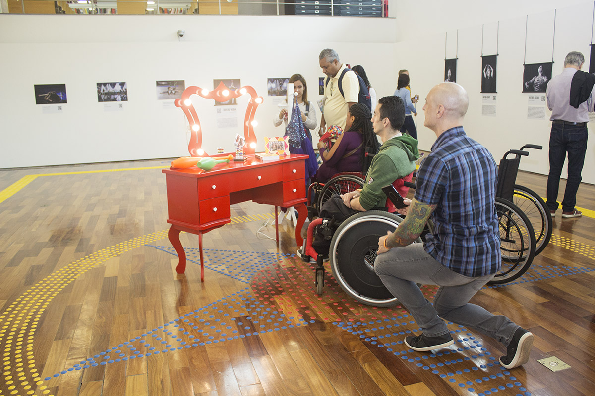 Quatro estagiários de Cenários trabalharam na montagem de “Circo Sem Limites”, que traz 28 imagens dos fotógrafos Gui Maia, Juliana Chalita e Luciana Whitaker e é totalmente acessível, com legendas em braile e audiodescrição. Os jovens da Spectaculu montaram toda a exposição, que conta também com um picadeiro no centro do espaço expositivo, criado com piso tátil. Um dos elementos cênicos usados no espetáculo, o trapézio pode ser manuseado em visitas guiadas através de maquinário montado pela equipe da escola.