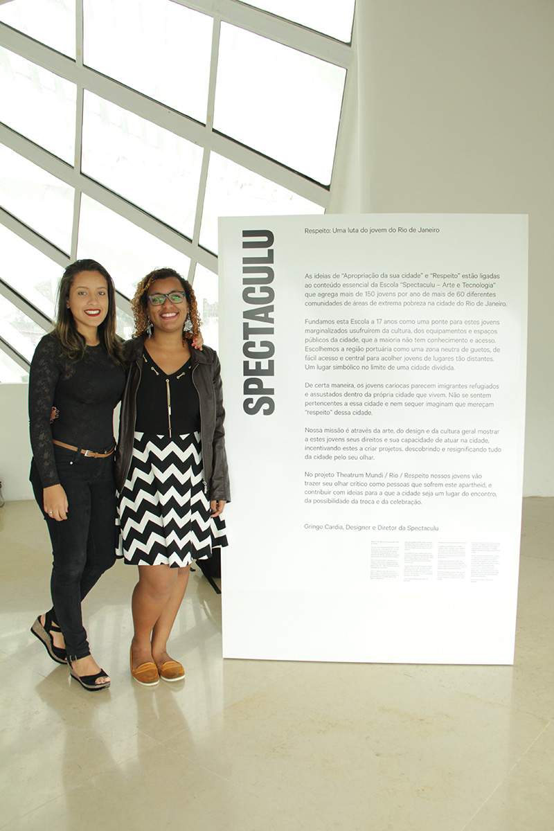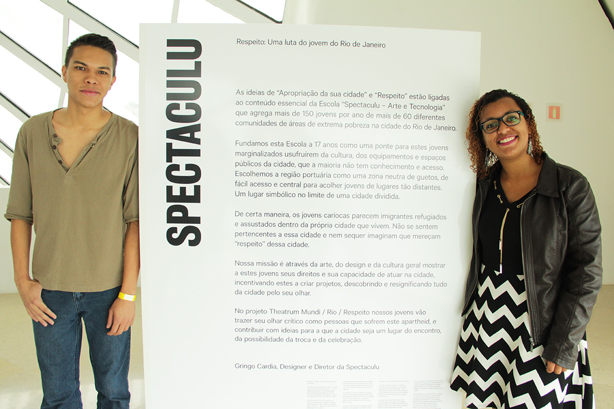 A Spectaculu foi uma das convidadas especiais da Mostra Respeito: Designing Respect. 14 projetos selecionados ocuparam o lounge do Museu do Amanhã de 04 a 23 de outubro – seis deles foram criados por alunos da escola. A mostra, promovida por Theatrum Mundi, People’s Palace Projects e Museu do Amanhã, foi resultado do concurso internacional Designing Respect, que premiou as melhores ideias para a cidade do Rio sob a inspiração do tema respeito. 3 jovens da Spectaculu vão a Paris para representar projetos selecionados em um concurso especialmente desenvolvido para a escola.