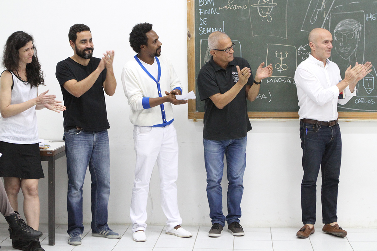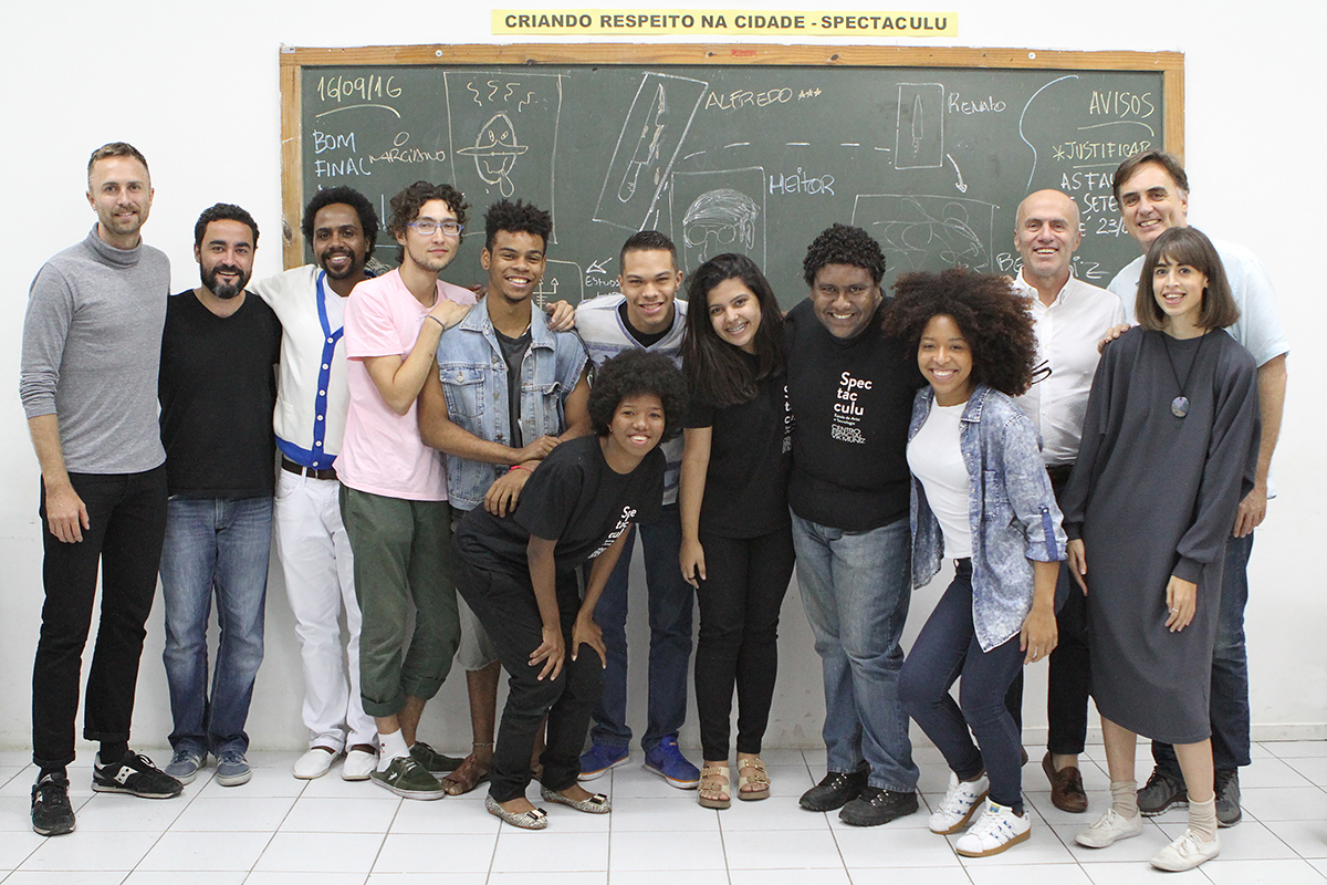 Adam Kaasa (Theatrum Mundi), Gringo Cardia (Spectaculu), Paul Heritage (People’s Palace Projects) e Jane Hall (Assemble Studio) ao lado da equipe Spectaculu e dos jovens responsáveis pelos projetos selecionados no concurso especial da escola (Créditos: Julianne Gouveia / Spectaculu)