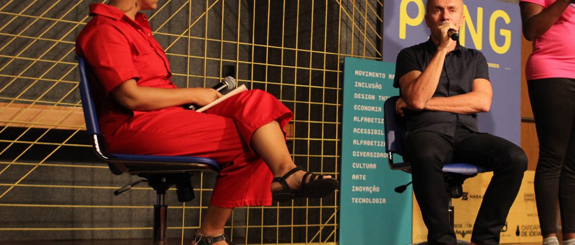 Com ingressos esgotados, arte, criatividade, oportunidades e juventude foram os temas abordados na palestra oferecida pelo cenógrafo e diretor da Spectaculu Gringo Cardia durante o PING Festival. Realizado em 21 de outubro, a iniciativa levou uma extensa programação como palestras e atividades ao ar livre para a Escola Eleva, antiga sede da Casa Daros. Gringo dividiu com uma plateia de educadores um pouco da história de 18 anos da Spectaculu na luta por formação e inserção profissional de jovens de baixa