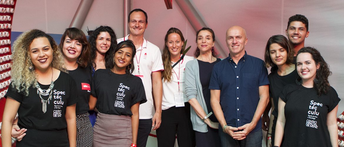 Jovens da Spectaculu são contratados para costura, adereços e camarim Através da parceria entre Spectaculu e Cerimônias Cariocas 2016, seis jovens da Spectaculu foram contratados pela equipe de figurino dos Jogos Olímpicos. Eles iniciaram as atividades como voluntários e foram selecionados entre os 20 jovens indicados pela escola, que trabalharam de fevereiro a setembro na preparação dos eventos. Parte dos voluntários e equipe de figurino da Rio 2016 Os jovens técnicos da Spectaculu trabalharam como assistentes de adereços e costura na equipe da figurinista italiana Silvia Aymonino. Os