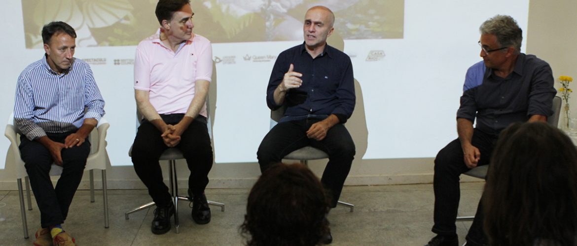 Programação contou com debates entre profissionais e jovens técnicos A “Mostra Spectaculu: Brasil e Reino Unido” realizou na Casa Rio, além da exibição de curtas-metragens e portfólios criativos, debates para troca de experiências entre autoridades culturais, educadores e jovens técnicos criativos durante os dois primeiros dias de exposição. Simon Dancey ( British Council), Paul Heritage (People’s Palace Projects), Gringo Cardia (Spectaculu) e João Guilherme Ripper (Theatro Municipal RJ) durante abertura da Mostra Spectaculu: Brasil e Reino Unido (Créditos: Ayrton