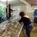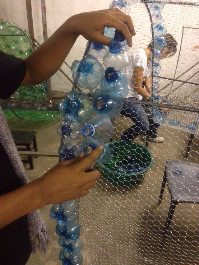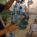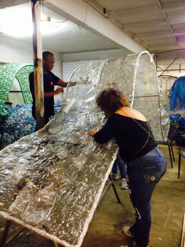 Jovens trabalham na confecção de escultura sustentável
