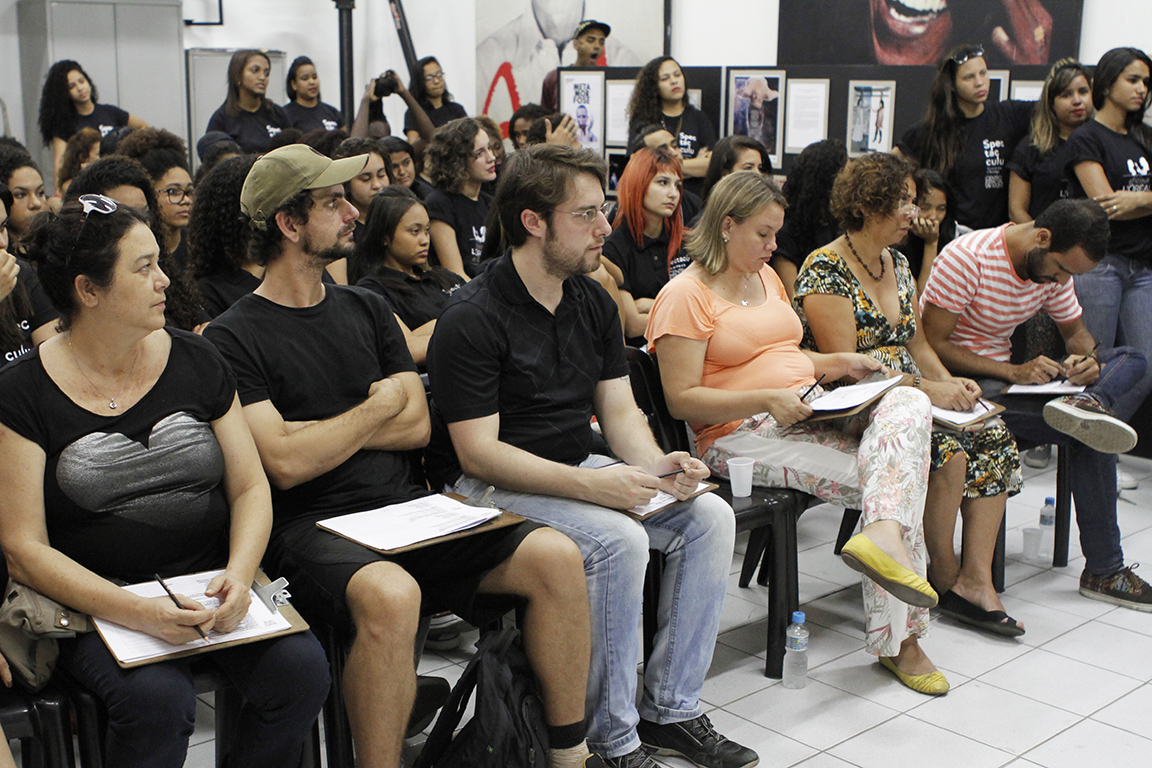 O coordenador pedagógico Rogério José explica as regras da competição para a plateia lotada de jovens do Núcleo de Artes Cênicas